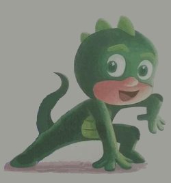 Gluglu (real name: Greg) (English name: Glue-glue) is the protagonist of the Les Pyjamasques book series. He is the youngest member of Les Pyjamasques. Official descriptionHe's strong, a little sticky, but great at hiding! Always ready to rush to danger to save you. Let the wicked be warned, here comes Gluglu! HistoryLong before the events of the book series, Greg met his friends Sacha and Amaya in school, and he was originally an average kid. In "La Légende des Pyjamasques," during the events where Sorceline used her powers to capture the animal totems, Gluglu, alongside Yoyo and Bibou, would receive magical pajamas and powers by one of the three animal totems. During their first encounter with Sorceline, he and his friends would learn that according to their legend, they had to help rescue the rest of the kids' animal totems. Eventually, he and the rest of the other Pyjamasques succeeded on freeing the animal totems to restore their legend, and trapped Sorceline and the rest of her Mitomites inside her magical sack from returning to do any harm to them. Physical appearanceAs GregGreg has pale skin, green eyes and a blonde parted hairstyle. During the daytime, Greg wears a green long-sleeved shirt with brown drawstrings and brown beige pants. Before the events of "Les Pyjamasques et la momie d’Apophis, Tome I," he originally wore brown shoes. In the nighttime, his pajamas consist of a pair of light green pants and a shirt featuring a lizard track pattern. His pajamas also have a white trim. As GlugluAs Gluglu, he wears a green one-piece costume with frills, a yellow-green underbelly and a tail to make him more lizard-like. His mask has an opening for his eyes and the lower portion of his face. In his appearances before "Les Pyjamasques et l'opération zéro," Gluglu's costume lacks dark green pads on his elbows and knees, and his eyebrows were the same color as the rest of his costume. In his solo appearance in the pilot episode of the PJ Masks, he is identical to his early appearances in the book series. However, his appearance is been given slight undertones related to superheroes such as his underbelly looking slightly detailed to what it looks like in his book appearances. PersonalityAs GregGreg is shown to have Sacha and Amaya's attitude on being curious and observing towards things that seem to have interest in school. As GlugluAs Gluglu, he is shown to be the most humorous and quirky member of the Pyjamasques, such as in "Les Pyjamasques et la momie d’Apophis, Tome I," he is shown to be joking on the appearance of Apophis' mummy strips, while "La Légende des Pyjamasques" shows him defeating the Mitomites by eating them. He is shown to be courageous and confident, as he is shown to not give up on letting villains such as Les Mascrapules get away with their antagonistic actions. He is also shown to get extremely grumpy whenever he's punished in school as emphasized in "Les Pyjamasques et Magistère la sorcière." He is also easy to temptation on mangos as seen in "Les Pyjamasques et le rêveur de l'arc-en-ciel." Alongside Bibou and Gluglu, he can be mischievous towards the villains they face such as taunting Les Mascrapules, and mocking Roméo Mécano. Like Yoyo and Bibou, he doesn't even speak in the English language and instead speaks only in French. Motive & AbilitiesMotiveIn most of his appearances, Gluglu and the rest of the Pyjamasques will often encounter and fight various nighttime villains that are mythology/folklore oriented. In addition, they would help friends in need who are also mythology/folklore oriented. Abilities