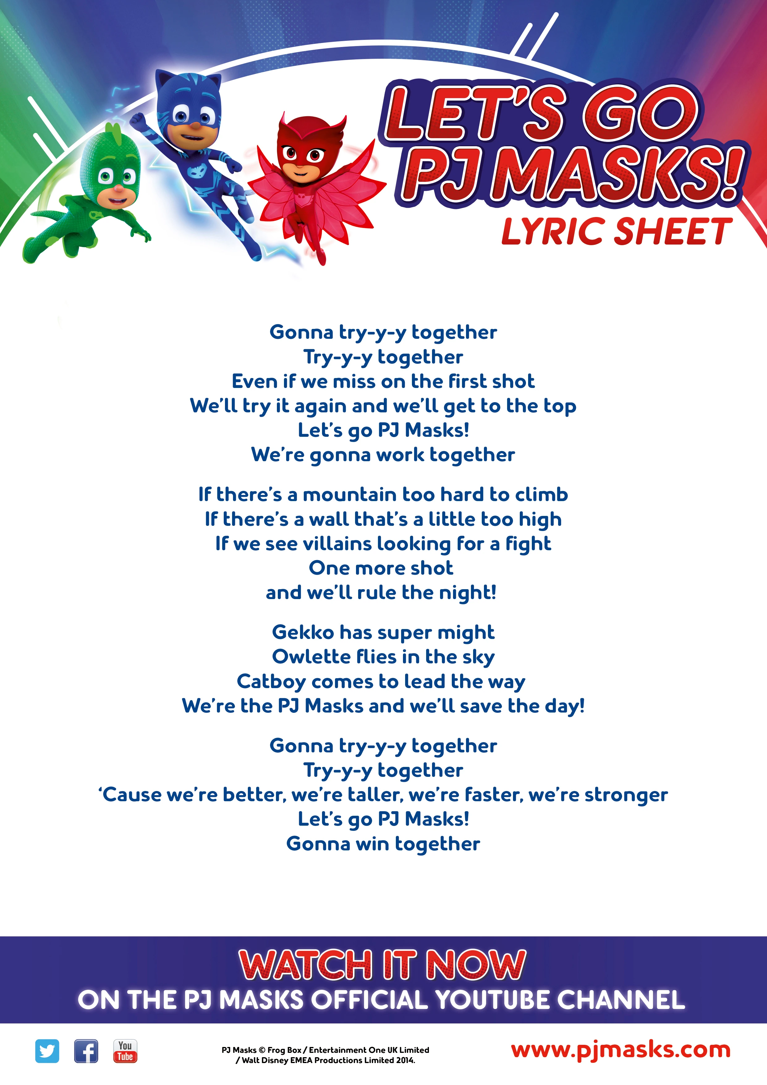 "Let's Go PJ Masks!" is a 1-minute song that was posted in the form of a music video to PJ Masks' official YouTube channel on August 10, 2016. Lyrics