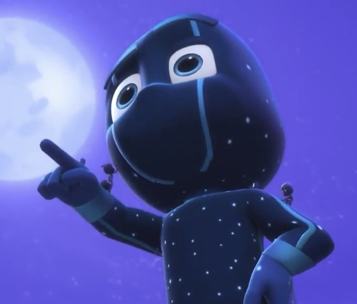Night Ninja's Statue is a big object created by Night Ninja and the Ninjalinos. It first appeared in the Season 1 episode "Owlette's Two Wrongs." The statue resembles Night Ninja himself, dressed in his original costume from before season 6, standing with one hand on his hip and one hand stretched out as if he's pointing at something. The statue is at roughly two stories tall, as it towered over the museum when put next to it. It is unknown what exactly the statue is made of. Role in the seriesIn "Owlette's Two Wrongs," the statue was created by Night Ninja and his Ninjalinos. To make sure people would watch it, Night Ninja ordered his Ninjalinos to steal all the other arts of the world, leaving just the statue. When the PJ Masks attempted to stop them, Owlette accidentally caused the statue's right hand to break off. At first she didn't care since Night Ninja had broken her Flossy Flash sculpture earlier, but she quickly came to regret her action when she saw how upset Night Ninja was over his statue being damaged. Night Ninja deemed the statue worthless and decided to drop it on the museum to destroy everybody's art. The PJ Masks were able to prevent this, and with some Sticky Splat as glue, they repaired the statue. Now that the statue was whole again, Night Ninja changed his mind about destroying it and decided to take it home so he could admire it all the time. The statue next showed up in Season 2's episode "Armadylan Menace," where Night Ninja and the Ninjalinos took the statue to the park with the plan to get rid of the PJ Masks Headquarters and put the statue in its place so everyone would see it. To keep the PJs busy, Night Ninja robbed the comic book store and tricked Armadylan into thinking the PJ Masks were responsible. After the heroes cleared up the misunderstanding, Armadylan attacked the Ninjalinos in the park, but was caught when Night Ninja used a huge ball of Sticky Splat to glue him to the foot of the statue. To prevent the Ninjalinos from moving HQ, Catboy used his Super Cat Stripes to anchor HQ to the foot of the statue. The PJs then freed Armadylan and dealt with Night Ninja and the Ninjalinos by trapping them with their own sticky splat. The statue appeared again in the short "Catboy Power Up," where Night Ninja once again planned to put it in the park at HQ's current location. In this short, Night Ninja referred to the statue as "new," suggesting it's actually a replacement for the previous statue, though it looks exactly the same. Catboy was able to thwart the plan by tying Night Ninja to the foot of his own statue with some Super Cat Stripes. In "Heroes of the Road," after Night Ninja, Romeo and Luna Girl succeeded in their plan to capture Newton Star, the PJ Vehicles and the PJ Riders, they proceeded to take over various parts of the city. Night Ninja had the Ninjalinos put his statue in the Park, and attached the Ultimate Control Device to the statue's hand so the villains could take over every vehicle in the city. With the help of the Speedy Twins, the PJs were able to free Newton and attempted to take down the statue. They managed to break the PJ Riders out of the control the villains had over them, and together, they toppled over Night Ninja's statue and broke the control device, putting an end to the villains' plan. GalleryGekko and Power Lizard in front of the toppled statue |