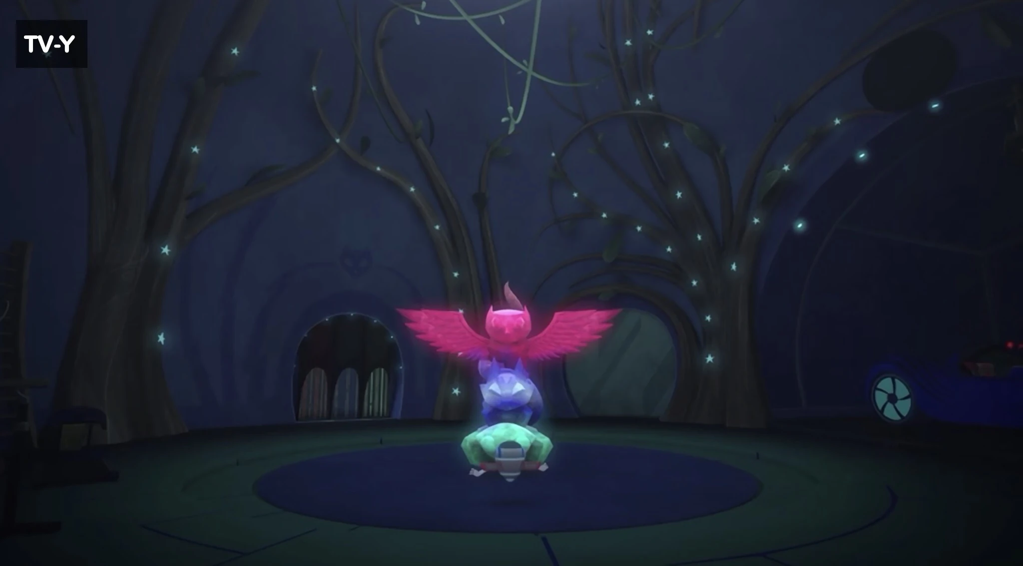 The PJ Crystal Totem (referred to as the HQ Crystal or PJ Crystal in the series) is a crystal totem that is the source of containing the supernatural powers for the PJ Masks' superpowered pajamas and HQ. Although it debuted in "PJ Power Up," it is unknown how the crystal was created and how it got in headquarters. In its debut episode "PJ Power Up," the PJ Crystal Totem was discovered by PJ Robot in headquarters. He knocked the crystal off its pedestal by accident while contacting the PJ Masks, causing them to lose their powers and revert back to their daytime identities. However, it was then resolved when the PJ Masks saw it for the first time and put the crystal back into its pedestal. Additionally, they also obtained new powers from the crystal to defeat Night Ninja. In "Take Romeo Off The Road," PJ Robot used the PJ Crystal Totem to help make the PJ Seeker. This is its first appearance since "PJ Power Up." In "Heroes of the Sky," Romeo used his Fly Bots to steal the PJ Crystal Totem to create multiple flying factories to take over the world. When they carried it to the Sky Factory, however, three smaller crystals, known as PJ Power Crystals, fell off. The PJ Masks later retrieved the crystal from Romeo, alongside other crystals stolen from both them and Luna Girl (such as Motsuki's crystal). In "Super Super Cat Speed," when Catboy attempted to increase his speed, he drained the crystal of its power, resulting in Owlette and Gekko losing their powers and transforming back into their civilian identities. In order to fix it, he transferred all of his power back into the totem, despite the risk of losing his powers forever. In "Ninja Power Up," Night Ninja used Lionel, Alley Cat and Owly to perform a ritual to make the crystal transfer the PJs' powers to him and his Ninjalinos. The PJs were able to reverse the ritual, which granted them new powers, and also bestowed powers on the 3 animals, turning them into the PJ Pets. In addition, the PJs' Spirit Animals once resided inside the crystal. In "Carly and Cartoka," the crystal was triggered by the destruction of the PJ Vehicles. In response, the Spirit Animals manifested from the crystal in physical forms to aid the PJs against the Speedy Twins. In "Heroes Everywhere," the powers from the crystal created the Power Q. Trivia