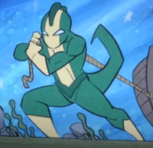 Slither Boy is a fictional superhero who exists in a series of comic books within the Cartoon Continuity. He is first seen in "Ninja Power Up" and used to be Gekko's favorite superhero. PJ Robot is also fond of his comics. Physical appearanceIt is unknown what Slither Boy looks like underneath his mask. He wears a green/yellow lizard-shaped costume with a tail and white pupilless eyes. AppearancesSeason 5